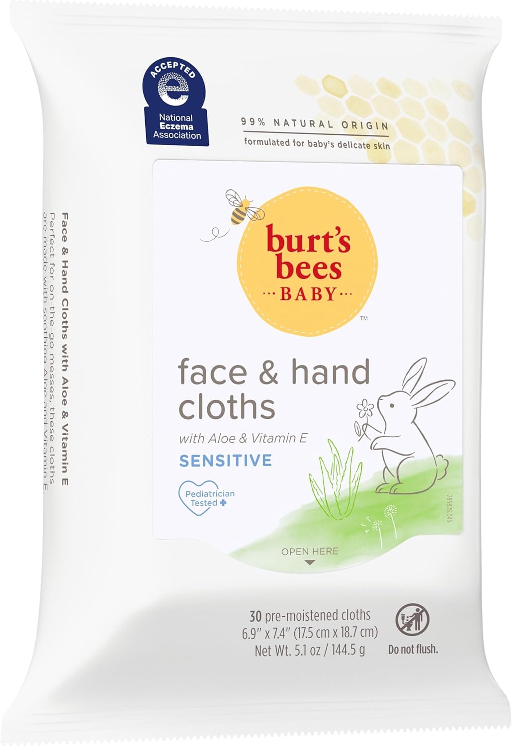 Pre moistened natural cleaning cloths designed to gently clean and moisturize your babys skin while on the go or at home. These soft fragrance free wipes are made with soothing aloe and vitamin E to moisturize, calm and aid in soothing the skin. Leave your little ones skin clean and feeling soft and smooth. Burts Bees Baby Face & Hand Cloths are 99.1% natural, hypoallergenic and made without parabens, phthalates, petrolatum or SLS. Nurture babys skin naturally with Baby Bee from Burts Bees.