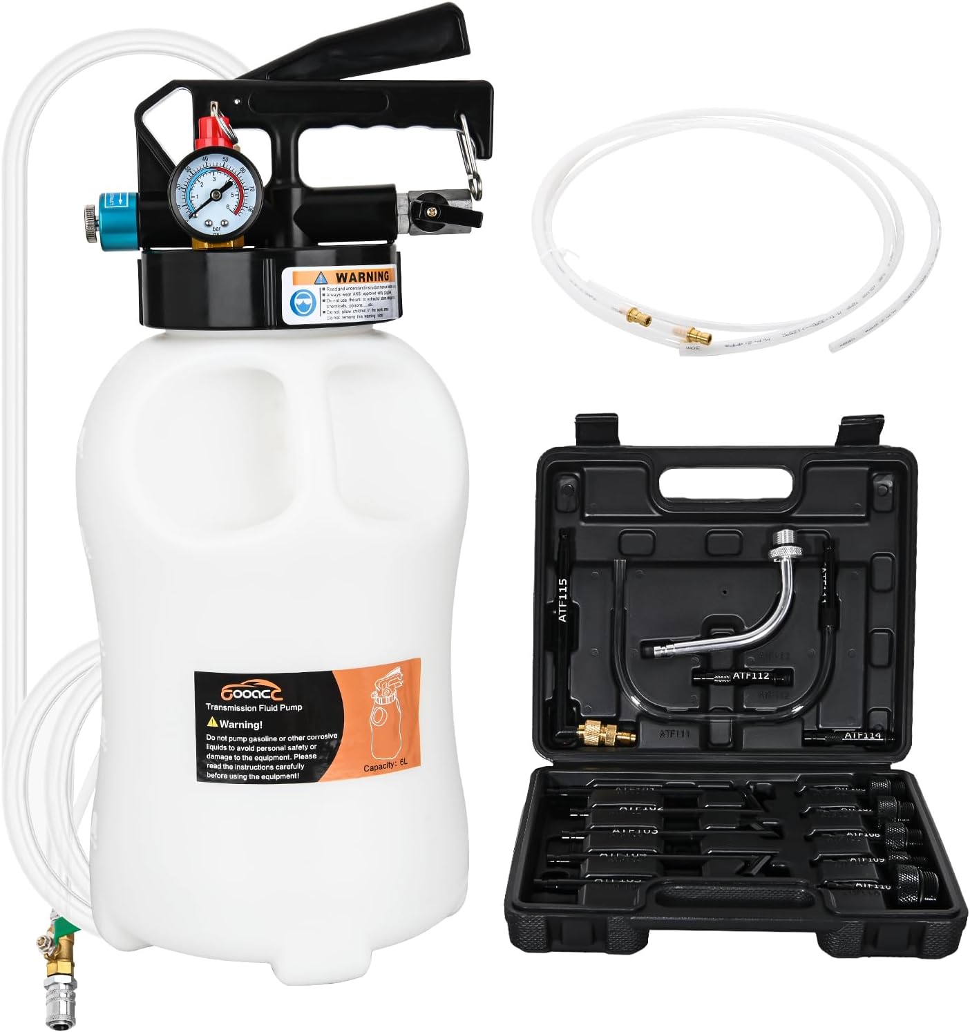 UNIVERSAL COMPATIBILITY: GOOACC pneumatic transmission fluid vacuum transfer pump comes with 15 Pcs ATF refill adapters in a tool case for easy storage and carrying. The 1/4 NPT air control inlet connects quickly to any standard air compressor. Widely compatible with Ford/ BMW/ Honda/ Nissan/ Hyundai/ Kia/ Infinity/ Toyata and most cars
