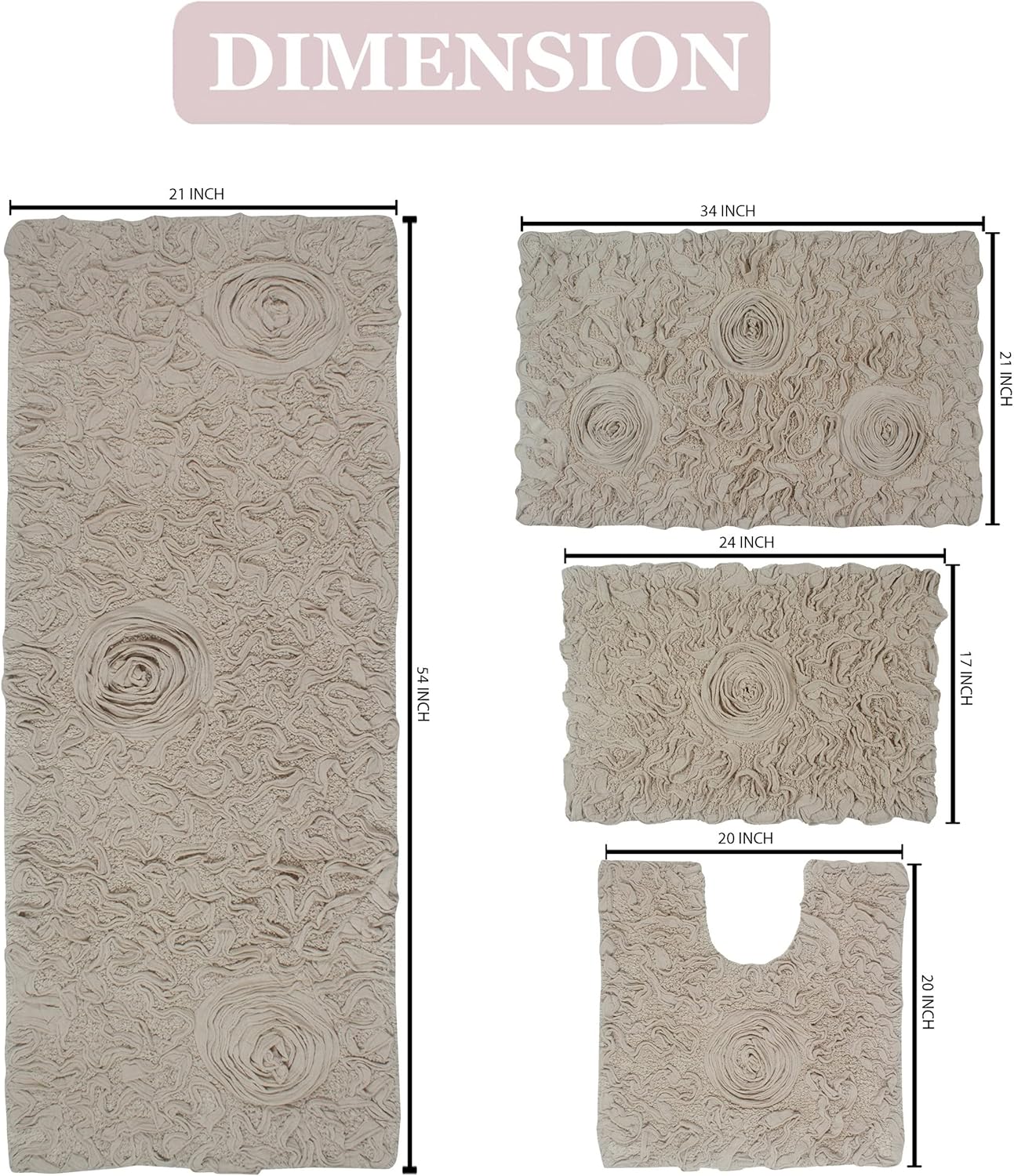 Excellent Product Set – Our rest room rug units embrace 1 small bathtub rug 17″x24″, 1 Medium bathtub rug 21″x34″, 1 runner bathtub rug 21″x54″ and 1 U-shaped bathroom bathtub rug. These 4 completely different sizes completely slot in your rest room and wash Basin space. And Remedy all of your issues without delay.