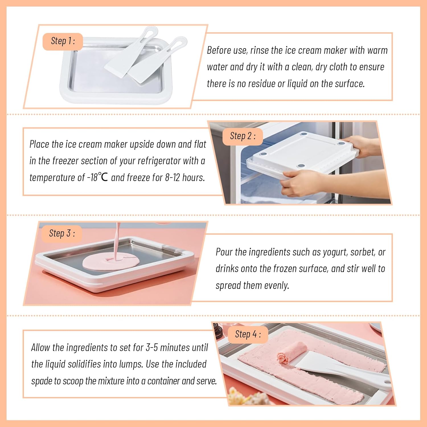 Easy to Use: Simply freeze the ice cream maker for 8-12 hours, pour in your mixture of ice cream powder and milk onto the frozen surface, continuously mix and stir until it becomes smooth and solid. After 3-5 minutes, gently scoop it up with a spatula, add fruits, nuts or chocolate chips and make ice cream rolls