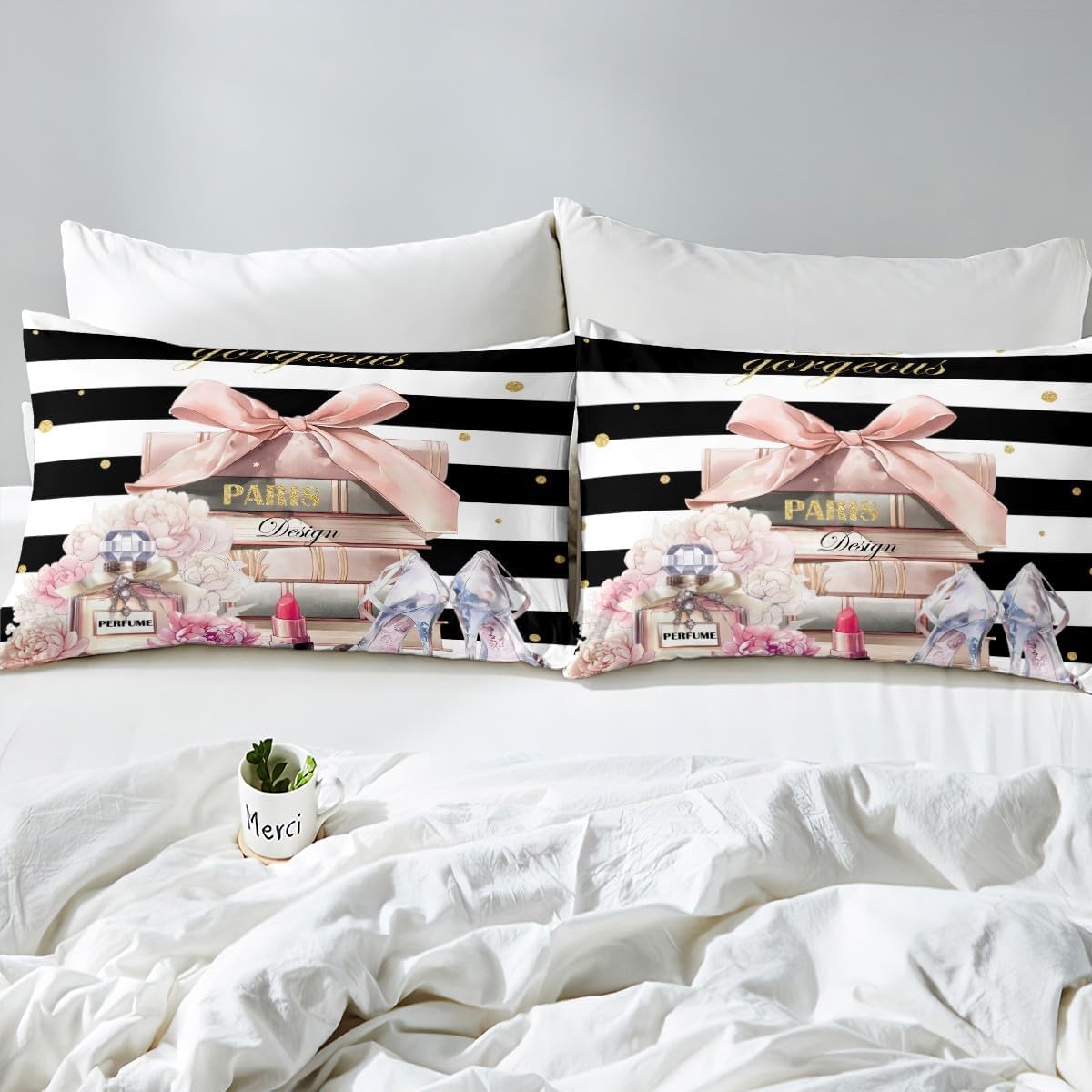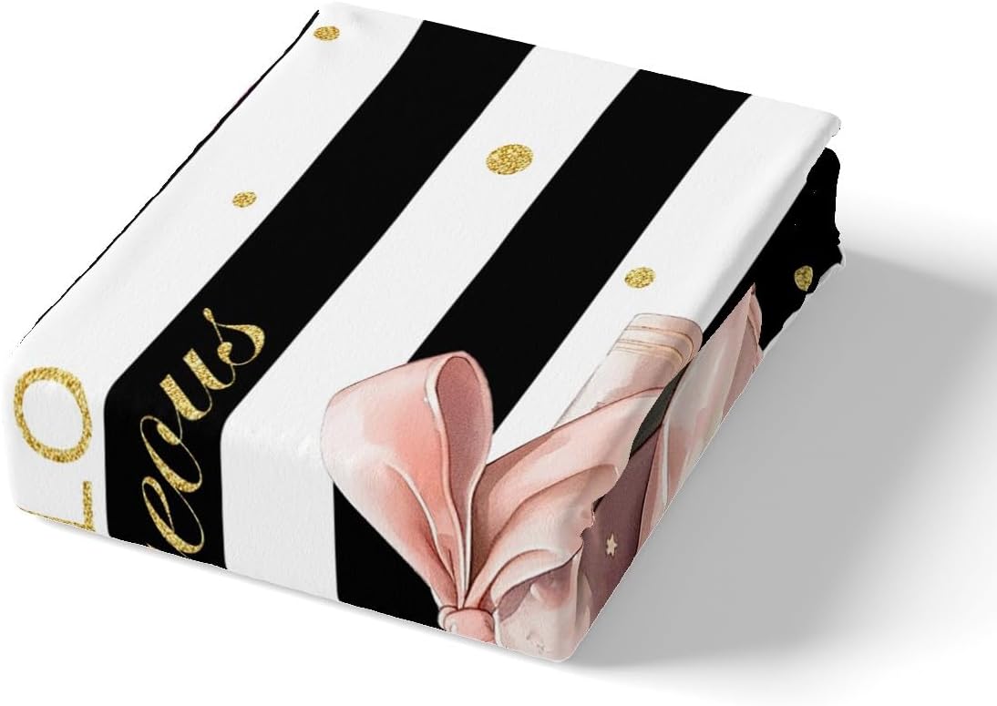 jejeloiu Pink Fashion Fitted Sheet Twin Size Kids Black White Striped Bed Sheets Set for Boys Girls Teens Floral Bedding Set Breathable Perfume High Heels Books Bedroom Decor