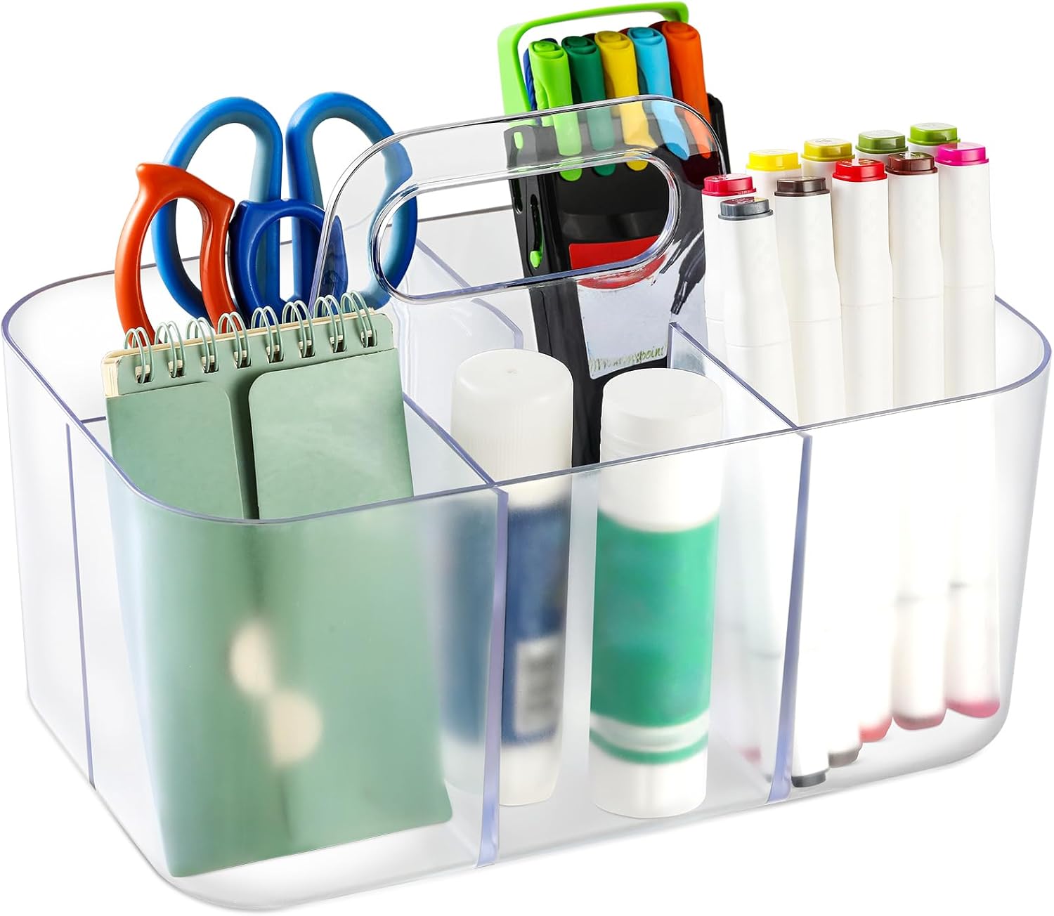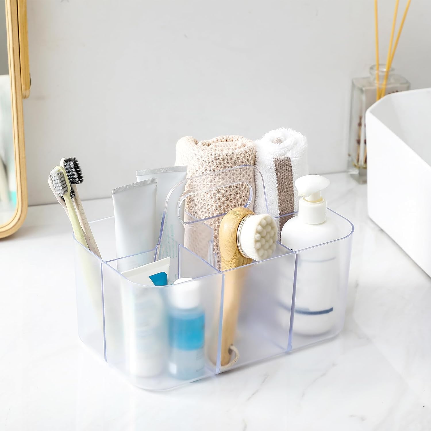 Multiuse Caddy Organizer with Handle – Stackable Plastic Bin – Divided Storage Tote Holder for Art Craft Supplies, Makeup, Bathroom, Shower, Cleaning, Kitchen, Office, Dorm, Desktop – Frosted Clear