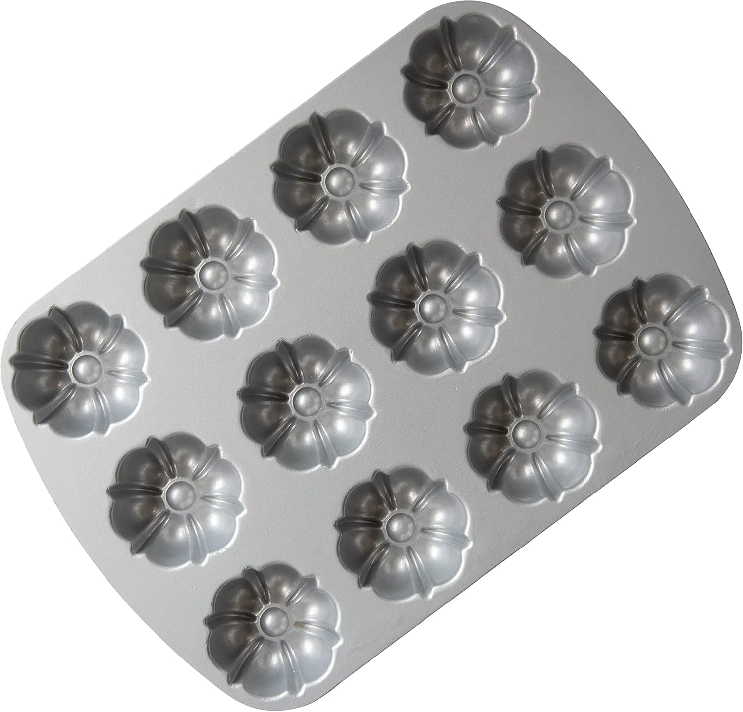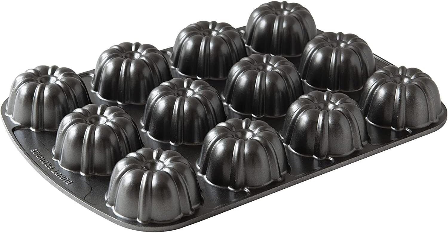 The Bundt® Brownie pan makes twelve 1/3-cup muffins or cupcakes. An easy way to dress up a bumble brownie. Use & Care 1. Before initial use and after subsequent uses, hand wash with warm, soapy water. Extended soaking is not recommended. 2. Before each use, brush with butter or shortening and dust with flour or cocoa to coat. Baking spray containing flour may also be used. Do not use regular cooking spray. 3. Mixes and recipes may vary. Fill the pan no more than 3/4 full to avoid overflow. 4. Metal utensils, scouring pads and abrasive cleaners should not be used on nonstick surfaces.