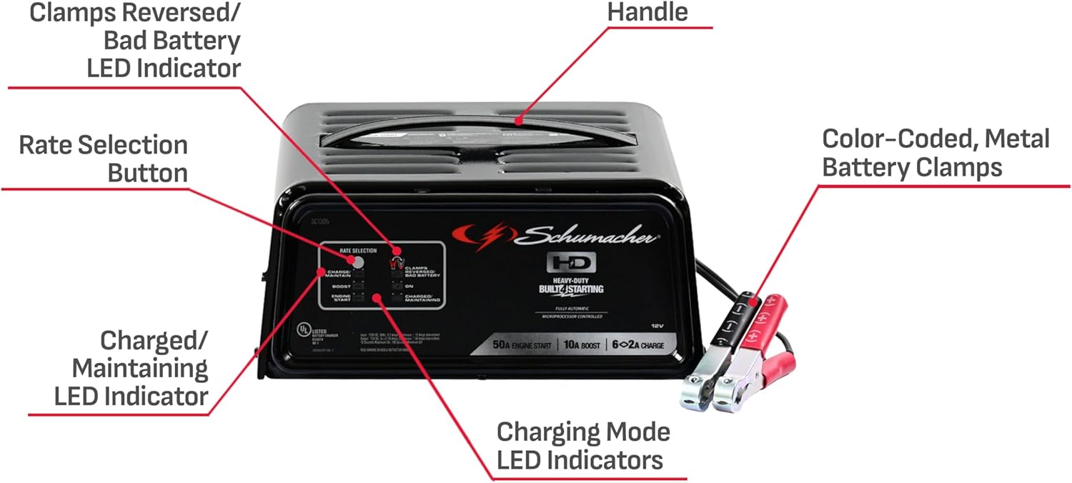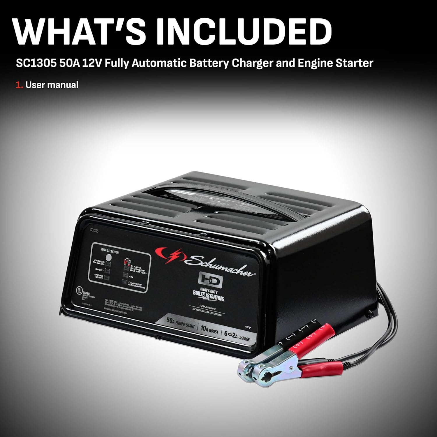 Full Bundle – Schumacher Electrical SC1305 4-in-1 6A Battery Charger and 50A Engine Starter and a consumer handbook