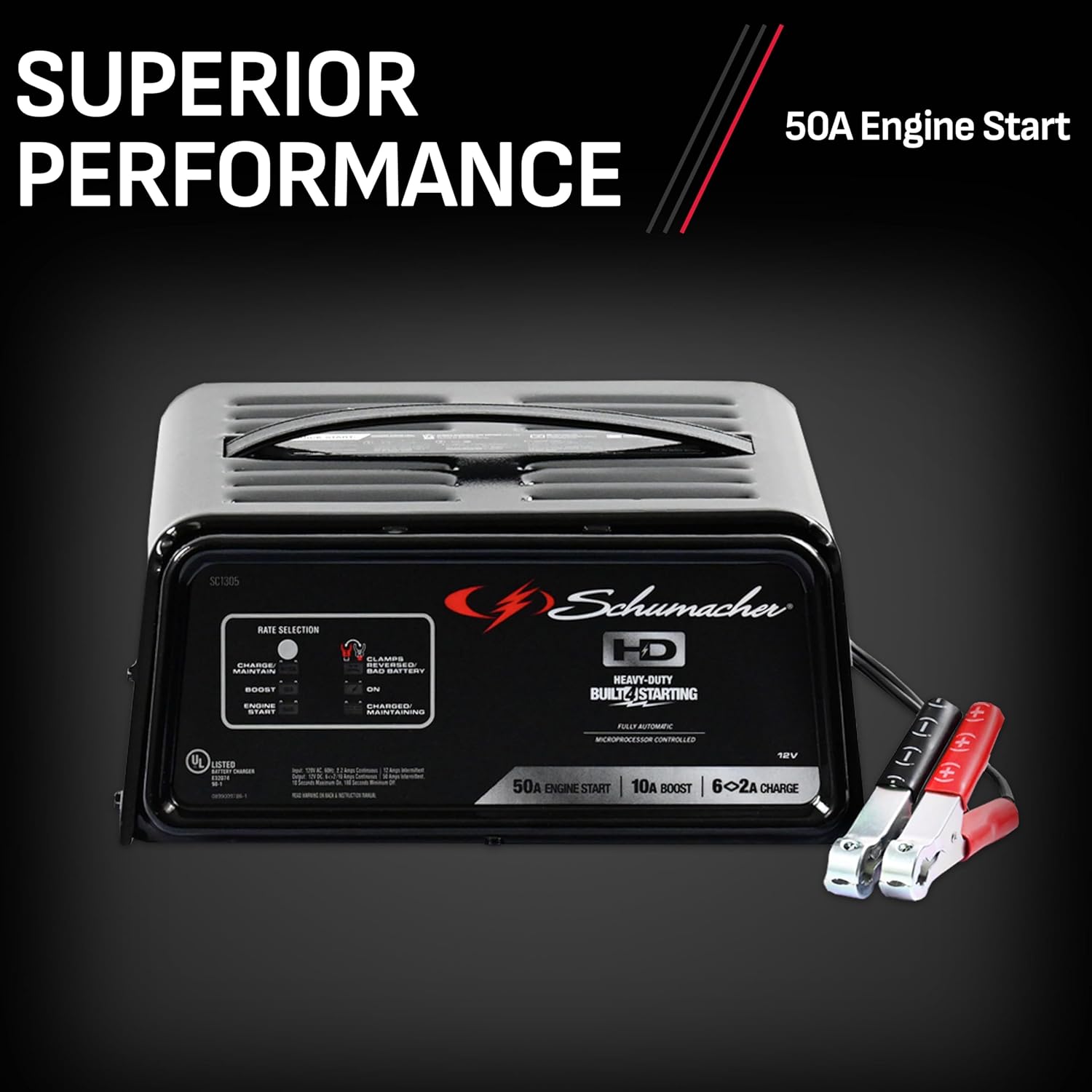 Designed to resist powerful use by critical residence mechanics, the Schumacher Electrical SC1305 4-in-1 Totally Computerized Battery Charger and Engine Starter is ideal for on a regular basis engine beginning and battery charging/sustaining. The SC1305 options 50-amp engine begin, 10-amp increase, and 6-amp to 2-amp cost/keep charges. Plus, it options sturdy development with a metallic enclosure that may stand as much as bumps and bruises. Totally automated and microprocessor managed, the SC1305 boasts superior options resembling multi-stage charging, unhealthy battery detection, float mode monitoring, and reverse hook-up safety. It’s suitable with 12-volt normal and AGM batteries. Different options embrace LED indicators, a push-button interface, and color-coded clamps. Diseñado para resistir el uso intensivo de los mecánicos aficionados, el cargador de batería y arrancador Schumacher SC1305 de 50A y 12V es perfecto para el arranque diario de motores y la carga/mantenimiento de baterías. El SC1305 cuenta con capacidades de arranque de motores de 50 A, refuerzo de 10 A y carga/mantenimiento de 6 A<>2 A. Además, tiene una carcasa metálica resistente a golpes y abolladuras. Totalmente automático y controlado por un microprocesador, el SC1305 cuenta con funciones avanzadas como carga multietapa, detección de baterías defectuosas, monitoreo del modo de flotación y protección contra conexión inversa. Es suitable con baterías de 12 V estándares y AGM. Otras características incluyen indicadores LED, una interfaz con botones y pinzas codificadas por colores.
