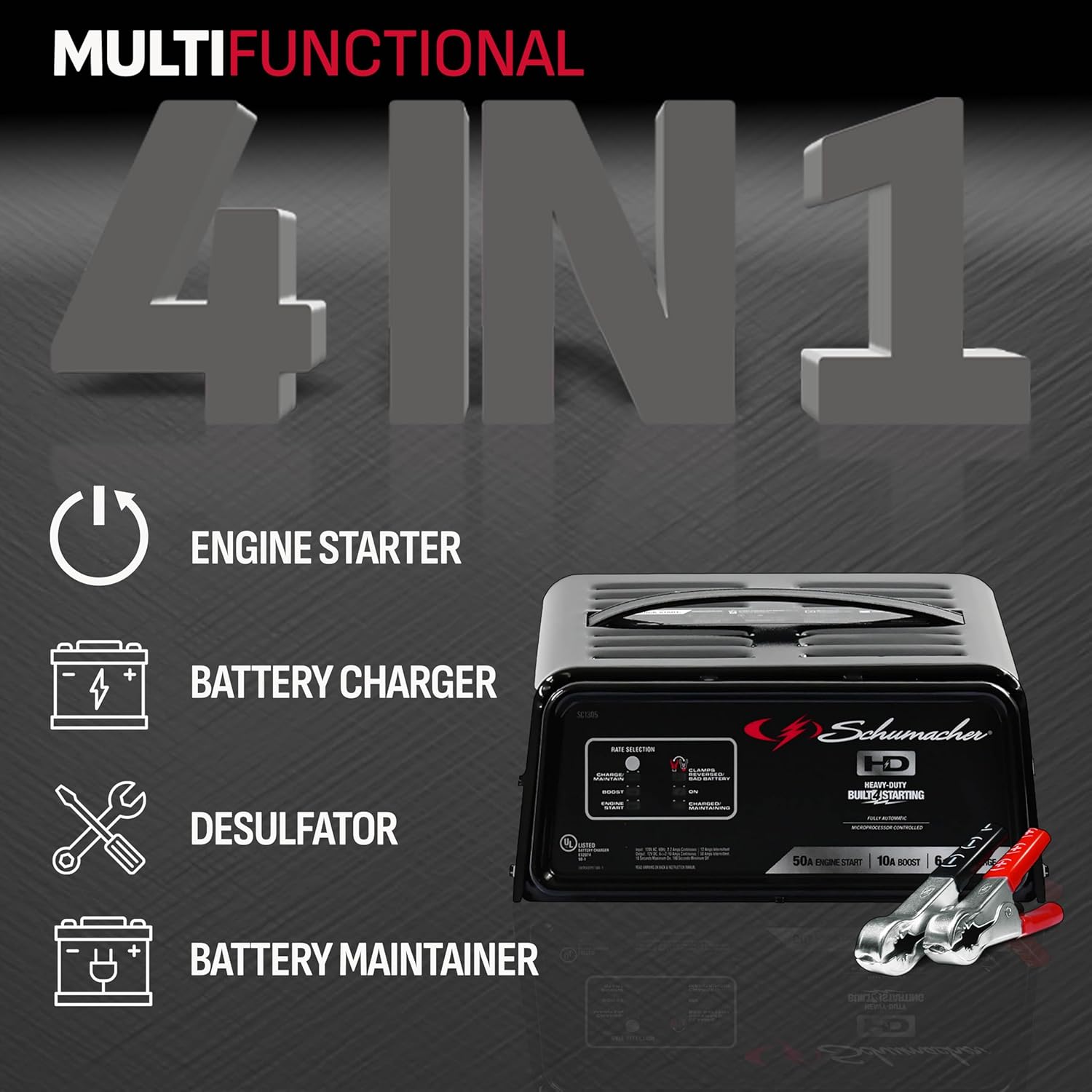 4-in-1 Machine – Battery charger, battery maintainer, engine starter, and desulfator